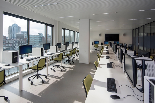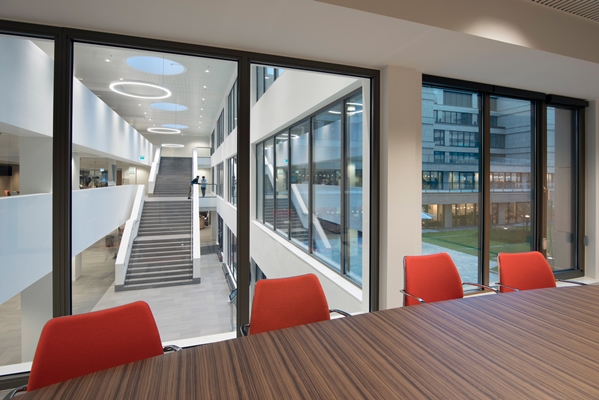 De indeling van de stafafdeling is in nauw overleg met de gebruikers uitgewerkt in een afwisseling van 1 en meer persoons kamers, gecombineerd met een open werklandschap en concentratie- en overlegplekken.Het casco (ontwerp Geurst & Schulze Architecten) heeft een rustige basis met witte muren en plafonds. Het interieurontwerp voegt aan de lichte basis warmte toe door toepassing van bamboehouten wanden, kozijnen en maatwerkmeubels. Een diversiteit aan losse meubels brengt verder kleur en oriëntatie, en geeft sfeer aan de ruimtes. De collegezaalstoelen zijn ook gefabriceerd naar ontwerp van Studio Leon Thier, door de positieve reactie heeft de fabrikant besloten om de collegezaalstoelen in hun collectie op te nemen. Afwisselende accentverlichting geeft een welkome aanvulling op de basisverlichting.