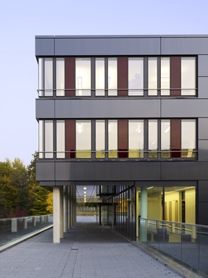 The questions come from the business sector; the universities apply their interdisciplinary expertise and knowledge to the respective project implementation. The building for “Intelligent Technical Systems” in 2011 represented an initial cornerstone for this initiative. The cubic structure is located near the Heinz Nixdorf Institute, the HNF Museum, and the b.i.b. College of Economics building ensemble. Along with the boulevard, the new building will extend the whole complex towards the south-east. As such, it is the starting point for the future development of the whole project. The building itself is fl exible and forward-looking. There are spaces offering opportunities for exchange, discourse and presentation as well as smaller rooms for concentrated research. The central lobby links all fl oors and areas of research. It is the building’s “business card” but serves as an open communication platform for users and visitors as well. The building envelope is characterised by ribbon windows set between opaque surfaces made of dark iridescent ALUCOBOND