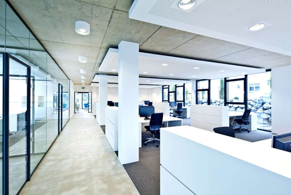 is reflected in the interior design of the building. The colour palette is muted and plain, and the overall appearance is only divided up into different areas by the light blue corporate identity colour of the company. An important feature of the interior design is zoning to define the different working areas. The impressive reception area and offices for about 20 employees are located on the ground floor. On the first floor, there are additional offices for about 10 members of staff, a large conference room, and a common room with kitchen and access to an exterior patio. The basement houses the storerooms and cellars.