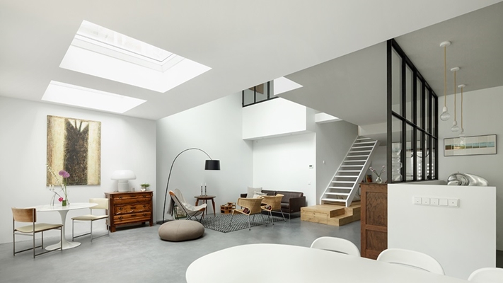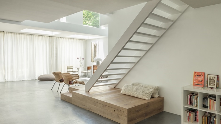 Openheid is een sleutelwoord in deze transformatie. Zelfs het huurappartement hangt als het ware in de woning en draagt zo bij aan de open sfeer. “Ik houd ontzettend van de architectuur van Rietveld en Le Corbusier uit de jaren twintig en dertig van de vorige eeuw. Dit vertaal ik graag naar de huidige opgave. We hebben in dit project dan ook voor een zo open mogelijke plattegrond gekozen. Het creëren van licht, lucht en ruimte, daar gaat het om en dat is in dit project erg goed gelukt.”