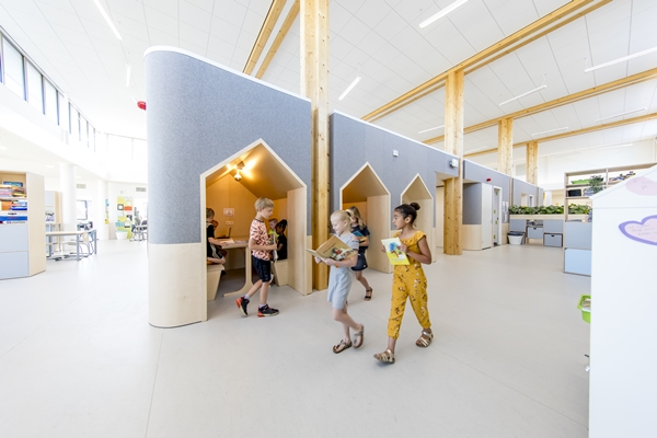 Grote vloeiende leerpleinen vormen de basis van het ontwerp, waarbij zelfstandig en uitdagend onderwijs en de interactie tussen de gebruikers centraal staat. Vanuit de kleine instructielokalen kunnen de kinderen uitwaaieren om te werken op de leerpleinen, waar diverse speel- en leerplekken zijn gerealiseerd. Naast de vaste interieurobjecten zijn hiervoor ook ruimte-scheidende kasten integraal mee ontworpen in het plan.