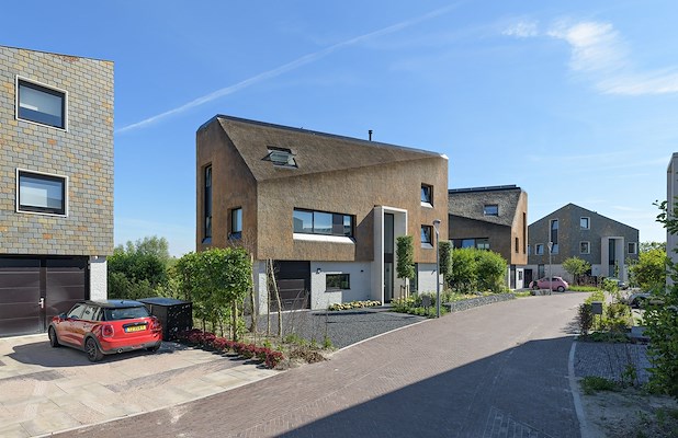 De woningen hebben een rijke materialisering met rieten- en leienkappen op een sokkel van een witte breuksteen. Hiermee krijgen de woningen een landelijke uitstraling met een markante strakke vormgeving. De begane grond, met mooi metselwerk en hoge puien, geeft de beleving van een sokkel. De woningen zijn zo op de kavels gesitueerd dat deze zich openen naar de tuinen.