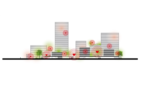 Aan de Torenallee volgen formele blokken met grote gevelopeningen de strakke randen van het plangebied. Ruime entreepartijen markeren de toegang van de woongebouwen. De zuidzijde heeft een kleinschalige en genuanceerdere opzet. De blokken zijn hier lager om aan te sluiten op de naastgelegen woonwijk en zonlicht toe te laten. Tussen de twee clusters is een doorsteek gemaakt ter plaatse van de grote plataan. Dit groene pleintje verbindt de woonwijk met Strijp-S.