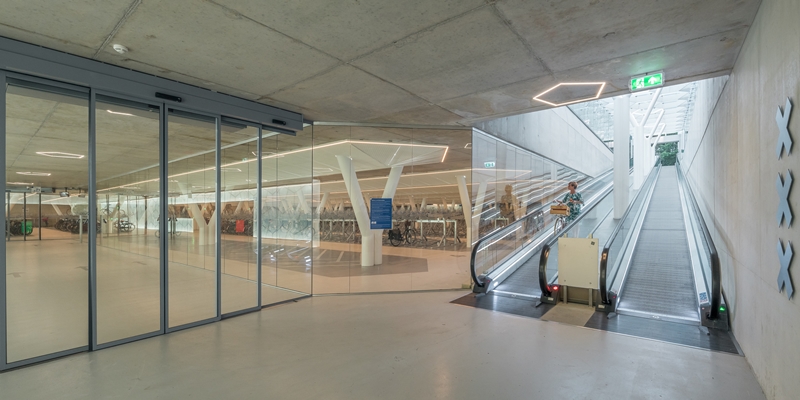 De fietsparkeergarage is op te vatten als een publiek interieur, maar ook als een ondergrondse buitenruimte, een ‘verdubbeling’ van het bovenliggende groene plein. De ruime en overzichtelijke opzet vormt de basis voor een vloeiend en probleemloos functioneren van de voorziening. Boomvormige stalen kolommen en plafondeilanden als bladerdekken bepalen het beeld, gevat in een eenvoudig en strak betonnen volume voorzien van een rustige epoxyvloer.