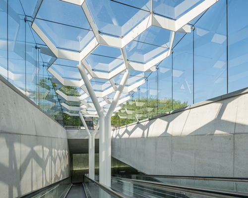 . Deze bevinden zich in een uiterst transparant hardglazen paviljoen dat de ruimtelijke werking van het nieuwe plein ongemoeid laat. De inwendige constructie van dit paviljoen bestaat uit een ranke stalen pergola. Het dak daarvan is een vrijdragend ruimtevakwerk dat als een ragfijn bladerdek boven de entree zweeft.