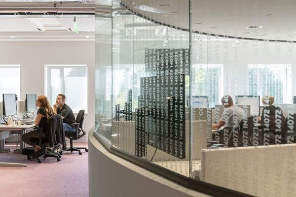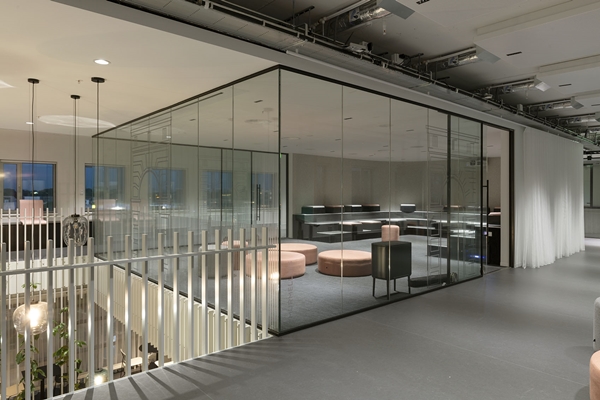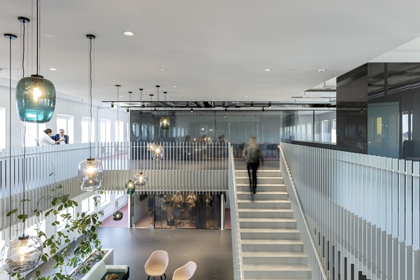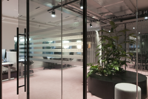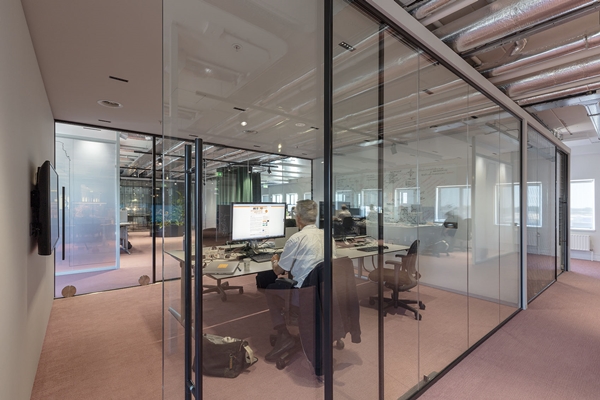 De binnenwanden zijn gesloten parallel aan de gevel en transparant haaks op de gevels. Hierdoor ontstaan lange zichtlijnen doorheen het gebouw. Door in de transparante wanden schuifdeuren op te nemen ontstaan nieuwe looplijnen wanneer deze (vergader)ruimtes niet in gebruik zijn. En dat is, zelfs bij intensief gebruik, toch bijna 30 tot 40 procent van de tijd. Om de plattegronden een nog menselijkere maat te geven zijn op veel plekken translucente beschrijfbare wanden neergezet. Deze pyrasied-wanden scheiden de ruimtes maar vormen ook samenwerk-plekken voor scrum- en agile werkvormen. En stiekem oriënteren ze de blik naar buiten.