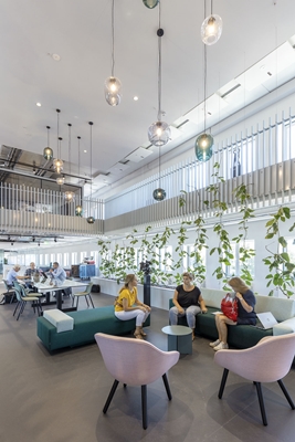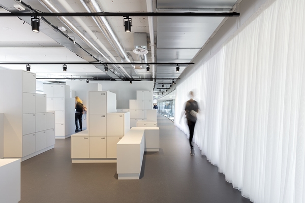 Een werkdag begint op de derde verdieping in het netwerkcafé en service-center. Een vraag over een vergaderruimte of een mobiel apparaat? Een kop thee met een externe relatie? Of een startup-bespreking met een nieuw gevormde projectgroep? Alles kan op deze plek. Zelfs de ruimte met lockers heeft een prominente plek en is vormgegeven als een informele overlegplek.