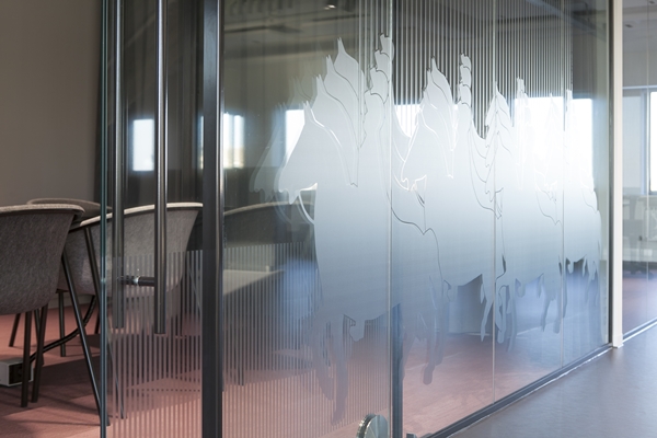De transparante wanden van de vergaderruimtes zijn elk voorzien van een graphic. Bij het openen van de schuifdeur bewegen twee lagen glas over elkaar heen en ontstaat een beweging in het grafisch patroon. Een boot die de polder in vaart. Een polsstokbriefje wat leesbaar wordt. Een klapperende vleugel van Victorie. De graphics roepen vragen op bij de gebruiker. In elk ontwerp zit een spiekbriefje met het verhaal.