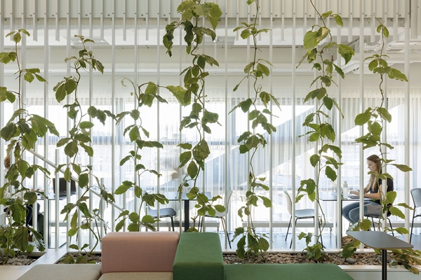 Het kleurenpallet is zoals gezegd beperkt. Plafonds, buitengevels en installaties zijn zuiver wit. Binnenwanden, trappen en balustrades zijn zacht grijs. Kozijnen en vast meubilair zijn zwart. Tot slot is accent gezocht in vloeren en losse inrichting. De vloerafwerking in de collectieve zones is zwart linoleum terwijl in meer individuele werkomgevingen gekozen is voor een oud-roze vloerbedekking. De zachte reflectie van deze kleur in de technische installaties aan het plafond zorgt voor een warme gloed. Atypisch voor een kantoor. Met de groene accenten in losse inrichting en beplanting ontstaat ondanks een erg beperkt pallet toch een expressief zacht geheel. Dit wordt aan elkaar geregen door de transparantie van alle haakse binnenwanden.