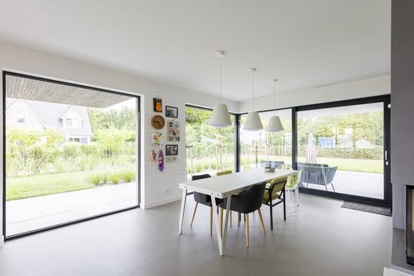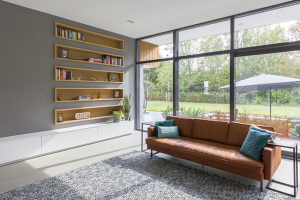Woonkamer met zicht op tuin en groene strook achter kavel