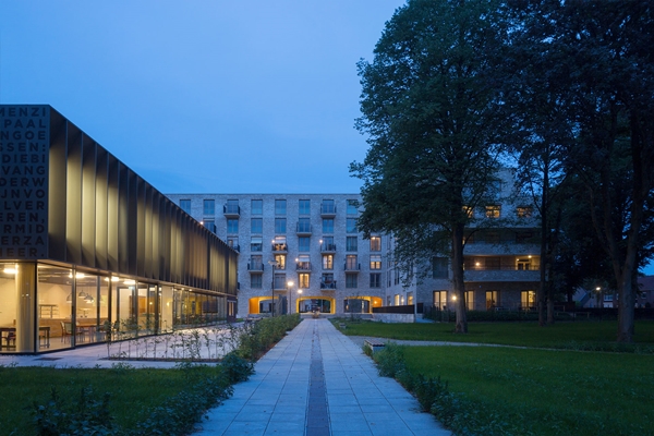 De drukkerij werd gewaardeerd op historische waarde, waarbij bleek dat de latere uitbreidingen weinig tot geen toegevoegde architectonische, ruimtelijke of functionele waarde hadden. Deze zijn er dan ook vanaf “gepeld” tot de eerste bouwfase plus éen latere uitbreiding over bleven. Hier werd vervolgens een nieuw deel aangebouwd waarbij duidelijk af te lezen is wat oud en nieuw is. De begane grond kreeg een zo transparant mogelijk karakter om daglichttoetreding en zicht op het park te maximaliseren. De verdieping is als een alzijdig element geplaatst dat ook binnen afleesbaar is en zowel binnen als buiten laat zien waar oud en nieuw in elkaar over gaan. Hier bevinden zich de kantoren en zo zijn alle functies herkenbaar in hun vormgeving en materialisatie. Door met ritmiek en open/dicht te spelen ontstaat er een alzijdige dynamiek. De geanodiseerde bronskleur komt terug in de kozijnen van het woongebouw en deze kleur is weer afgestemd op het metselwerk van genoemde gebouwen. Op de dichte kopwand op de verdieping is een kunstwerk gerealiseerd van Marc Ruygrok. Een tekst uit “