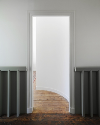 Op de eerste verdieping zijn de originele houten vloerdelen die onder een versleten tapijt tevoorschijn kwamen opnieuw geschuurd en gelakt voordat deze vloer werd teruggeplaatst als afwerkvloer. Een ruime walk-in closet deelt deze verdieping in twee en resulteert in een bijzondere gebogen verbinding tussen hal en gastenkamer volgend uit de draaicirkel van de deur die haar originele centrale positie in de hal behouden heeft. In de hal is een nieuwe groen-grijze lambrisering aangebracht met een geĂŻntegreerde railing die houvast moet bieden tussen slaapkamer en badkamer.