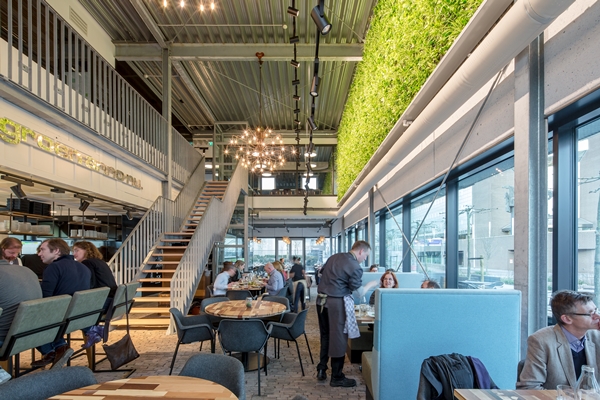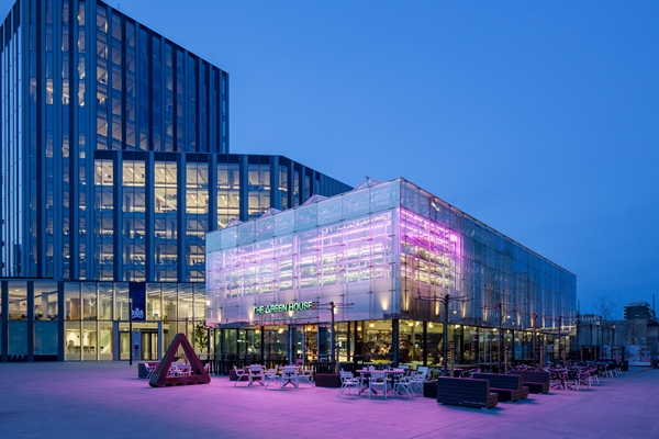 de restaurantkeuken geteeld. Een vide in het paviljoen maakt de publiek toegankelijke kas goed zichtbaar vanuit het restaurant beneden. Ook grote groenwanden dragen belangrijk bij aan de beleving van The Green House. Het dak van het paviljoen is gevuld met zonnepanelen.