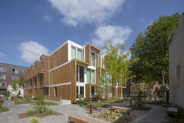Acht lichte en moderne familiehuizen vormen een moderne stadshof samen met een oud schoolgebouw. De intieme stedelijke binnentuin is samen met Hosper landschapsarchitecten en de huidige bewoners ontworpen als gemeenschappelijke ruimte.