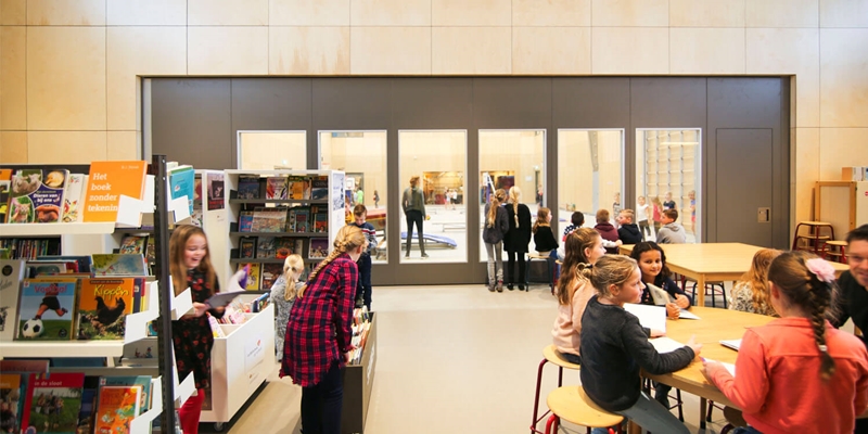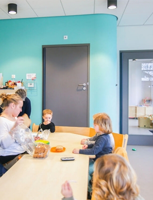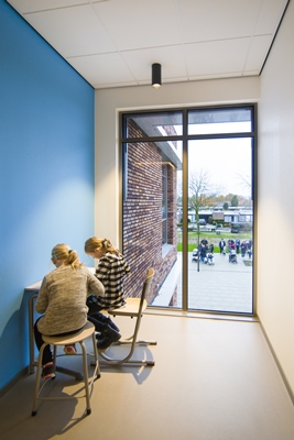 In dit gebouw zijn de doorlopende leerlijnen, de samenwerking tussen kinderdagopvang en basisschool, geborgd. Doordat de ruimtelijke aula eenvoudig wordt gecombineerd met de gymzaal en speellokalen, ontstaat er één groot, kloppend hart. Dat is echt van meerwaarde voor de gebruikers. De ruimte is zo op alle mogelijke manieren inzetbaar. De scholen en het kinderdagverblijf bevinden zich rondom de centrale ruimte.