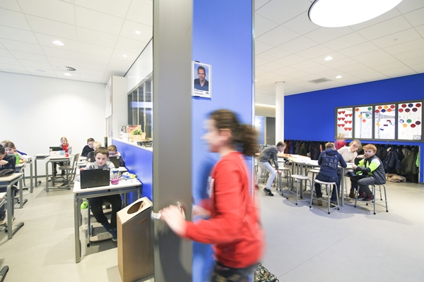 Het interieur is afgewerkt met een beperkt aantal materialen. Dat zorgt voor een luxe uitstraling en duidelijke verbinding. Het centrale hart is met hout bekleed, dat ook terug te vinden is in de individuele ruimtes. Toch is er ook voldoende ruimte voor eigenheid. De partijen hebben ieder een eigen accentkleur en de onderwijskundige visie bepaalde de grootte van hun lokalen en leerpleinen.
