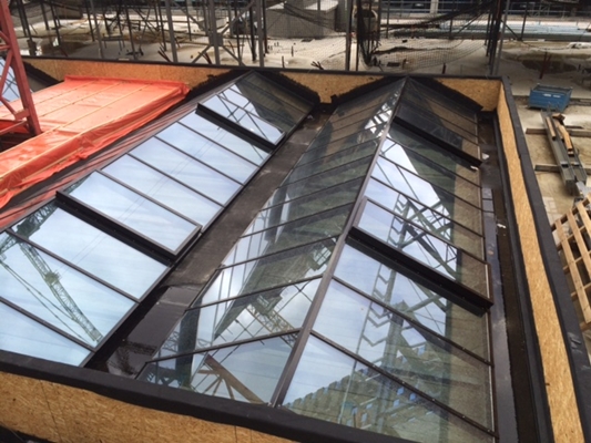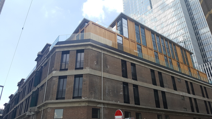 Een ander argument is dat EPDM in vergelijking met traditionele bitumen geen onaangename geur afgeeft bij warm weer. In combinatie met de lange gebruiksduur (meer dan 50 jaar) is EPDM dakbedekking bij uitstek geschikt onder een dakterras dat intensief wordt gebruikt. De appartementen op het dak zijn eveneens voorzien RESITRIX® MB. Vanwege de windbelasting en de stevige luchtstuwing door de omliggende hoogbouw, is de dakbedekking en isolatie op deze lichthellende daken mechanisch bevestigd in de overlap. De naden zijn eveneens geföhnd met hetelucht.