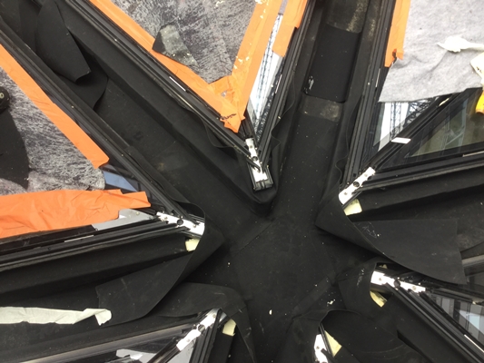 Op een raster van voornamelijk diagonaal lopende stalen balken zijn driezijdige glazen piramides geplaatst met daartussen bakgoten voor de waterafvoer. Het ingewikkelde samenspel van piramides en goten vroeg om op maatgemaakte oplossingen om waterdichte verbindingen te realiseren.