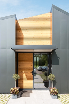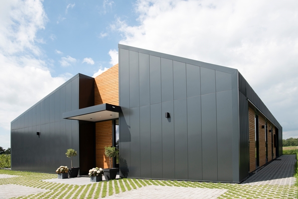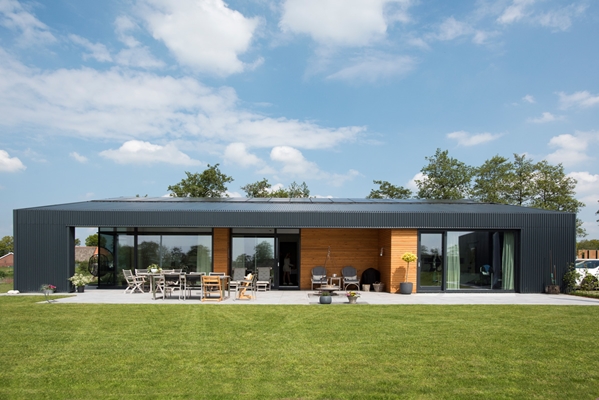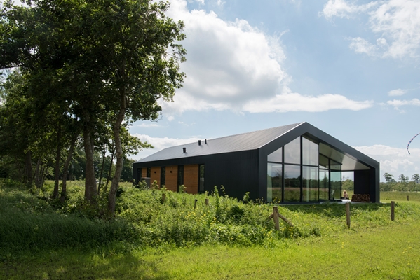 De woning refereert aan de vele schuren uit de omgeving: een asymmetrisch dak met strakke lijnen, waarbij de gevel en het dak in een uniform materiaal is gedetailleerd. Door de vorm past de woning goed in het landschap en de materialisatie geeft het een eigentijdse uitstraling.