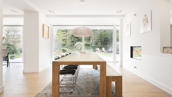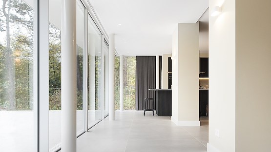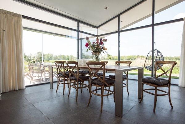Langs de west- en zuidgevel liggen de belangrijkste verblijfsvertrekken met een prachtig uitzicht over het Opeinder Kanaal en het vergezicht over de weilanden. De royale glasgevels liggen terug onder het dakoverstek zodat de zonbelasting in de zomer wordt beperkt, maar winterzon de woning kan verwarmen.