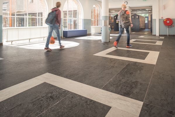Patroon tegels perfect uitgedacht - Wachtend in de monumentale hal schuifelen leerlingen met hun iPhone langs. De ruimte ademt rust en regelmaat. De vloer is donkergekleurd met leistenen tegels, die prachtig passen bij de uitstraling van het trappenhuis met de ronde bogen. Maar zijn het eigenlijk wel leistenen tegels? Nee; het is de nieuwe norament arago rubber vloer van Nora Flooring Systems.