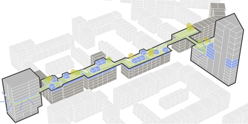 Omdat 75% van het dakoppervlak nodig is voor zonnepanelen is gekozen het resterende dakvlak goed te benutten. Een collectief dakpark van 360 m lang in het hart van de wijk vormt een bijzondere straat op hoogte. De ‘Skywalk’ biedt bewoners en bezoekers een unieke ervaring en een prachtig uitzicht op de stad. ‘Show movement’ is een uitgangspunt voor de Skywalk. Met de trap naar de 5