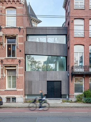 Tussen een openruimte met een rij herenhuizen springt het moderne gebouw EENWERK eruit. In het ontwerp heeft de architect gekozen voor een contrast met de bestaande bebouwing. Een combinatie van basalt, dat vroeger gebruikt werd voor sierstenen, samen met grote glazen aluminium puien geeft de gevel een klassieke opbouw.