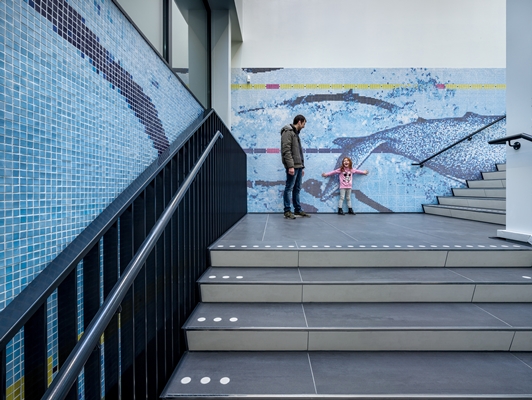 Voor zwembaden gelden strenge eisen als het gaat om de veiligheid en duurzaamheid van materialen. Het iconische beeld is daarom uitgevoerd in een innovatief pixel-perfect mozaïek van 160m², bestaande uit 967.375 tegels. In zijn totaliteit geeft het mozaïek eigenheid aan het zwembad en verhoogt het de kwaliteitsbeleving van het entreegebied.