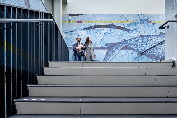 Silo creëerde samen met Kraaijvanger Architects een verrassend, gastvrij en veilig entreegebied. Voor de wanden van de entreehal creëerden we een doorlopend beeld waarin handgetekende illustratie en 3D-gemanipuleerde visuals gecombineerd worden. De meeste beeldelementen verwacht je wel in een zwembad: sport en spel, grafische belijning, felgekleurde vlotterlijnen, tegels, waterstroming en reflectie. In dit samenspel duiken ook drie walvissen op: groot maar goedaardig. Een surrealistische interventie die tegelijkertijd verwelkomend en zeer toepasselijk is.
