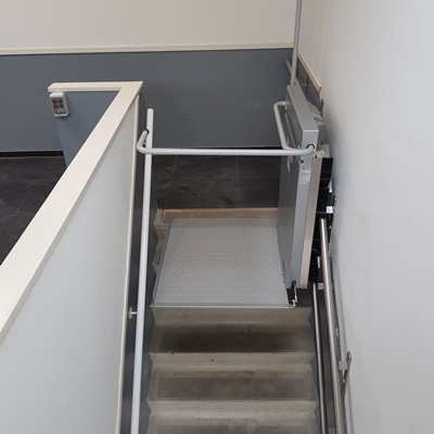 Een eis van de brandweer was dat de platformlift van de trap af kan worden geparkeerd. Hiervoor is een parkeerstand gecreeerd middels een uitloop aan de bovenzijde van de trap. Nadat de platformlift is gebruikt, kan deze worden opgeklapt en geparkeerd in de hoek.