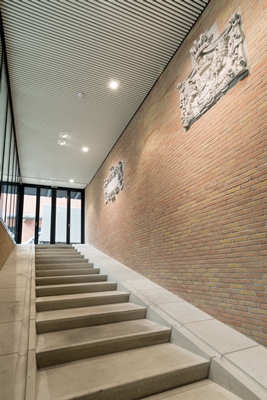 toegang nieuwe fietsenkelder, opnieuw ingemetselde ornamenten oud UB gebouw