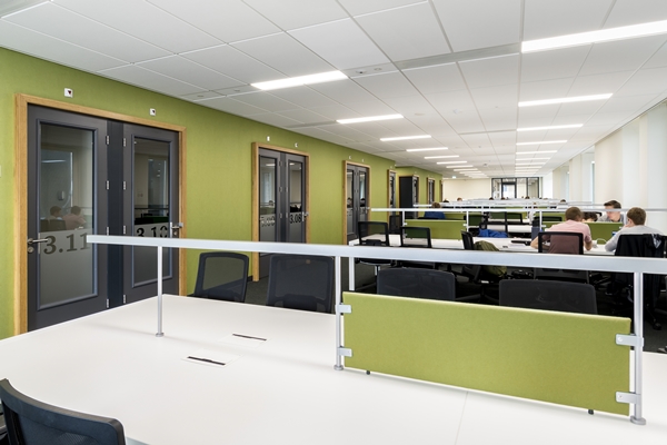 Het nieuwe witte plafond op de vierde verdieping maakt de ruimte extra licht