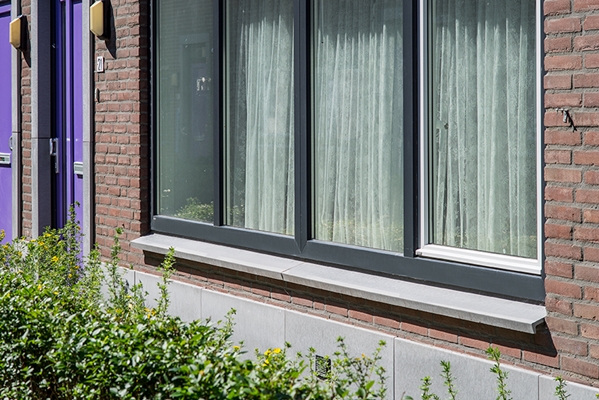 In dit renovatieproject zijn onze dagkanten, raamdorpels en gevelplinten verwerkt tot één mooi geheel. Al onze producten zijn geproduceerd in de Natura donkergrijs kleur, wat in combinatie met de opvallende paarskleurige voordeuren prachtig bij elkaar tot uiting komt. De keuze voor deze specifieke producten zorgen er mede voor dat het straatbeeld is opgewaardeerd en dat de wijk volledig met zijn tijd is meegegaan.