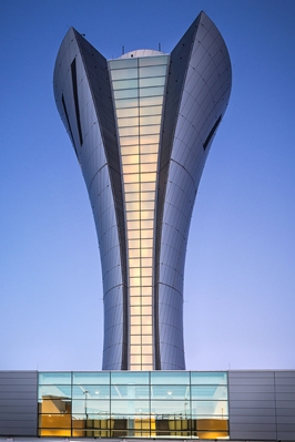 The new air traffic control tower is the tallest vertical selfcentring post tension concrete structure in the United States. ALUCOBOND® in the custom SFO Silver colour clads this spiralling torch-shaped structure. The west face of the airport control tower is “opened” vertically with a backlit glass façade that stretches into the air to create a local visual landmark. Paul Kim, AIA, NCARB, project manager, HNTB explains: “The intent was to provide a tectonic and elegantly detailed façade with a subtle but dynamic skin with spiralling aluminium panel joints around the conical surface. We also saw an opportunity with the tower’s location. Unlike towers at most airports, the SFO tower is located immediately adjacent to drivers and pedestrians. We wanted people to experience the tower up close as well as from afar. The tower was designed as an iconic symbol for the airport.”