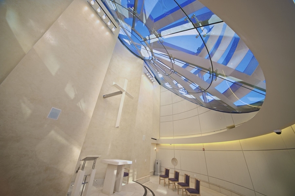 RBB Architects, created the tower’s AIA Design Award-winning architecture, which is clad in ALUCOBOND®. Keith Panel Systems fabricated 3100 ALUCOBOND® panels for the tower and chapel with the aid of three-dimensional modelling software. “There were several elements on this project with complicated geometry,” said architect Paul Dalzell. “We had to coordinate everything with the structural steel, glazing and stud contractors and used advanced three-dimensional collision-detection software to flag potential problems between trades; months before anything had been erected. This process allowed us to fabricate panels with dimensions pulled from the 3-D model, eliminating the need for field measurements and greatly accelerating the schedule. It was a good example of what BIM technology can yield.”