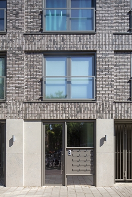 Aan de voorgevel is de Hagemeistersortering Haltern GT toegepast, gemetseld in een halfsteens blokverband. De sortering is in de penanten liggend en in de borstweringen staand verwerkt. Het traditioneel gemetselde halfsteens blokverband maakte het daarbij mogelijk om de dilatatievoegen te maskeren. Furkan Köse: "In het staand metselwerk konden we de knipvoegen mee laten lopen, zodat ze visueel wegvallen. De terugliggende voegen zijn antracietkleurig, waardoor de steen zelf beter naar voren komt in de gevel en ook de dilatatievoegen donker zijn. Zodoende ontstaat in het voegwerk één geheel."