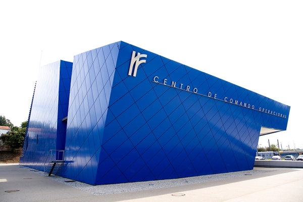 The operational control centre in Contumil, Porto is a building whose modern architecture enhances the area surrounding the station. This district is undergoing redevelopment and restructuring to encourage its ongoing integration into the urban environment. The control centre building, designed by the architect, Paul Calapez, is characterised by its volumetric appearance, and its prismatic geometry constitutes a striking stylistic element. The complex seems to float above the ground due to its stereometric façade surfaces made of ALUCOBOND®. The form determines the architecture, and both colour and façade grid system emphasize the form. Interlocking joints refer to the networking taking place in the interior of the building. In compliance with safety regulations, the interior lay out in the state-of-the-art control centre is semi-circular and this determines the centre’s design isometry.