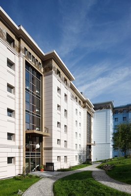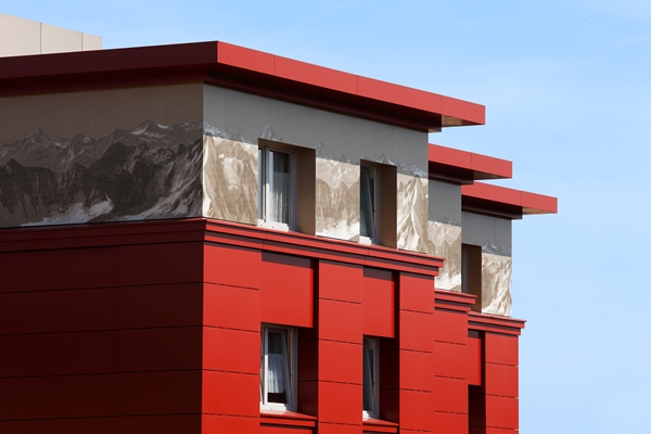 The large residential estate HöxterstrasseHagen of the Gemeinnützige WohnstättengenossenschaftHagen built in the 1970s shared the fate of many a residential sites of that time; they were considered as socialhotspots and looked extremely rundown. The integrated project approach of Stadtbildplanung Dortmund, remedied this problem. They planned the basic modernisation andenergy-conserving renovation of the façades, windows and roofs with solar systems. In addition, the entrances, lighting and stairways were renovated, and the green spaces and playgrounds were redesigned. The architecture focuses on the traditional structure and proportions, found in historic buildings in the 19th century. This narrative concept all eviates the seventeen grey residential blocks – allof the same shape – of their monotony and reinstates the building’s basement and mezzanine level, string course and canopies. Then arrow, dark entrances have been replaced by a generous portal, and the large house numbers above the canopies have made orientation considerably easier. Particularly worthy of mention is the mezzanine level which is decorated throughout with a pictures quemountain landscape. This is printed onALUCOBOND®. Inspired by the mountainpaintings of the artist, Edward Theodore Compton (1849–1921), the decorative picture relates to the hilly landscape of Hagen.The architects were also inspired by paintings where the seventeen different colours of the buildings are concerned; the colour compositions of light beige to dark red originate from the paintings of the Italian artist, Giorgio deChirico (1888–1978).