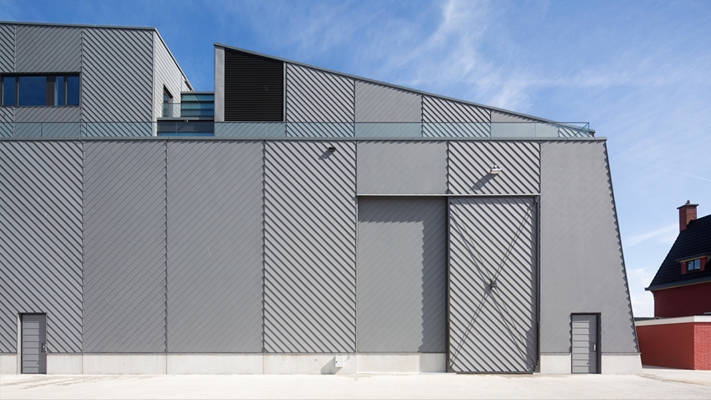 De gevel is gemaakt van gezet zinken planken in een visgraat motief. Door de speling van het licht op de gevel verandert het beeld constant.