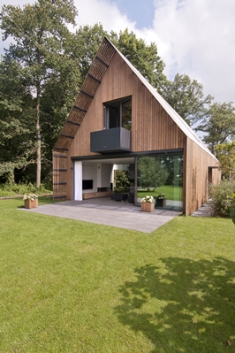 Architect eigen huis heeft een moderne schuurwoning ontworpen in een bos op Landgoed Duivenvoorde. De ruimten zijn zo georiënteerd, zodat ze allemaal een compleet andere beleving van de omgeving hebben. Bij de keuken komt het dichte bos tot vlak bij de gevel. Een enorm raam van 8,5 bij 2,4 meter een panoramisch beeld op het immer interessante bostafereel. De keuken is ook apart ontworpen door architect eigen huis en door een meubelmaker op maat gemaakt. De lineair geschakelde woonkamer, keuken en eetkamer, worden gescheiden door sfeervolle, semi-transparante panelen. Door de panelen weg te schuiven ontstaat één grote loft-achtige leefruimte. Gevel en dak zijn afgewerkt met biologisch gemodificeerd dennenhout. Dit is nagenoeg onderhoudsvrij en heeft een levenslange houdbaarheid.