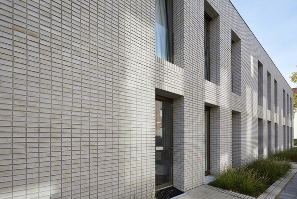 Die steen, dat werd de Hagemeistersortering Weimar HS in dunformaat. De Weimar is in de basis een wit-gele steen met een licht gekartelde rand, voorzien van extra kleiresten meegebakken in het oppervlak. Wessels: “Dat bezorgt de steen karaktervolle kleurtinten die harmonieus samengaan met de groene omgeving en maakt de steen tactieler. De sintering hebben we er maximaal uitgelaten, om een zo rustig mogelijk gevelbeeld te verkrijgen. Bij Hagemeister konden we deze baksteen perfect fine-tunen, zij kunnen het productieproces erg precies bijsturen.”