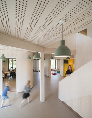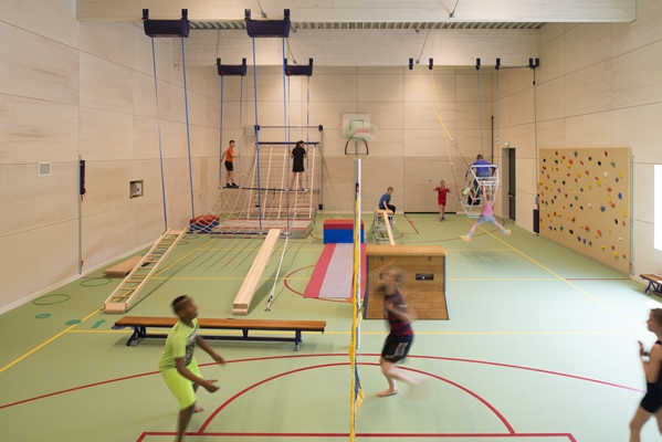 Ruwbouw is afbouw; de volledig houten constructie is met opzet overal in het zicht gehouden. Om binnen het stedenbouwkundig kader te blijven, hebben we compacte innovatieve houten kanaalplaatvloeren ontwikkeld, waarin verlichting en luchtbehandeling geïntegreerd is. Hiermee wordt bijgedragen aan het rustige beeld van het geheel, de verdiepingshoogte maximaal gehouden en voldoet de school aan de eisen van Frisse Scholen Klasse B.
