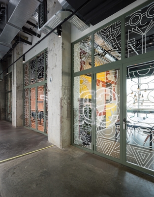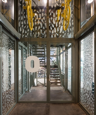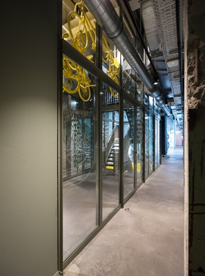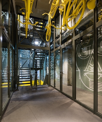 Ook aan de binnenzijde van het hotel staat transparantie centraal. Dit wordt gerealiseerd door het toepassen van glazen puien voor de diverse ruimten die aansluiten op de gemeenschappelijke ruimten en gangen. Hierdoor blijft het historische karakter overal zichtbaar. De keuze voor stalen Jansen profielen voor de binnenpuien sluit aan bij de oude stijl en het beton van het gebouw.