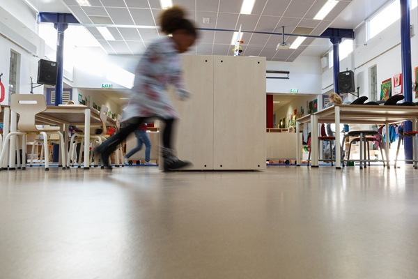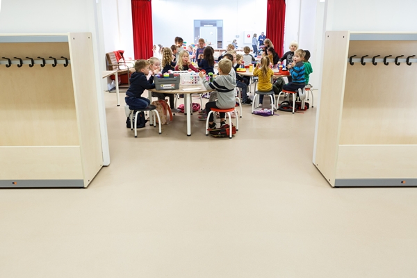 -kleur Sand, die in het hele gebouw op beide verdiepingen werd toegepast. Petra: ‘Deze kleur is gemêleerd, waardoor vuil en dergelijke op de vloer niet direct zichtbaar is. In Culemborg was een rode vloer aangebracht, maar diezelfde kleur zou in deze school te druk worden. Met de lichtere kleur Sand oogt de vloer neutraler waardoor de school een rustigere uitstaling kreeg.’