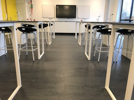 De opdrachtgever wilde een duurzame school. Dat wil zeggen energiezuinig en met milieuvriendelijke en sterke materialen. Op het dak liggen zonnepanelen, lichtsensoren in de lokalen reageren op beweging en een warmtewisselsysteem zorgt voor koelte in de zomer en warmte in de winter. Het gebouw is vrijwel geheel voorzien van duurzame rubber vloerbedekkingen van nora, in twee varianten. In het grootste gedeelte van de school is de noraplan unita toegepast. Het sterke norament – bestand tegen een stootje – is gekozen voor de binas- en technieklokalen. “Onze vloerbedekkingen hebben weinig onderhoud nodig, behalve schoonmaak”, licht Dennis Hulleman van nora toe. “De slijtvaste vloer is een goede keus als je een sterke vloer wilt tegen lage onderhoudskosten. De vloer hoeft niet in de was gezet te worden, is gemaakt van natuurlijke materialen en – over een prikkelarme omgeving gesproken – werkt ook mee aan geluidsreductie.”