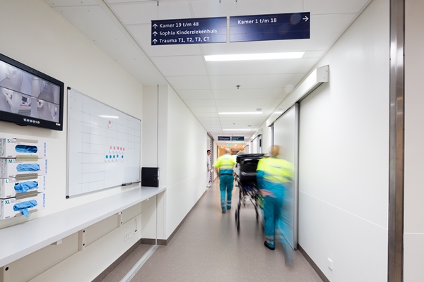 De rubber vloerbedekkingen onderscheiden zich doordat het een homogeen product betreft, zonder toegevoegde toplaag. “Daarnaast speelt er ook een ergonomisch aspect. Dankzij de verende werking ontlasten rubber vloeren knieën en rug, een belangrijk gegeven voor personeel dat de hele dag staat of over de afdeling loopt”, stelt Campo. Zoeteman wijst op de blijvende akoestische eigenschappen. “De vloeren hebben een 2 millimeter dikke laag die bij contact maximaal 6 dB geluid produceren.” Naast lage onderhoudskosten en het emissiearme karakter, legde ook de reinigbaarheid van de vloeren gewicht in de schaal. “Dankzij het gesloten oppervlak blijft vervuiling aan de oppervlakte en trekt niet in de vloer, waardoor onze vloeren goed te reinigen zijn. Zo kunnen we bijvoorbeeld in een OK desinfectantia van de vloer halen. En omdat de vloeren geen pvc of weekmakers bevat, gaan dergelijke medische stoffen hier ook geen reactie mee aan”, zegt Zoeteman. “Ook in geval van brand komen er geen toxische gassen vrij.”