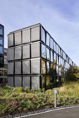 Het nieuwe gebouw, een soort grote rechte balk, is een aanvulling op de huidige kantoorgebouwen in het westen van de stad. Om het probleem van de helling te omzeilen, is het geplaatst op twee enorme betonnen kegels. De uitzonderlijke vormgeving van de gevel wordt gekenmerkt door de enorm grote ramen van vloer tot plafond, die letterlijk uit de gevel schieten met verschillende hellingsgraden. Hierdoor wordt met de verschillende weerkaatsingen van de lucht, de tuin en de directe omgeving een levendige en geraffineerde caleidoscoop gecreëerd.