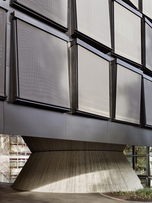 Een van de belangrijkste instructies van het bestek was dat het zonweringssysteem het bijzondere ontwerp van de gevel zo min mogelijk mocht verstoren en dat het zo mogelijk onzichtbaar moest blijven. Door de harmonieuze integratie van de behuizing van de zonwering in de raamkozijnen, die vooruitsteken met steeds andere hellingsgraden, kan het zonweringssysteem op discrete wijze worden aangebracht.