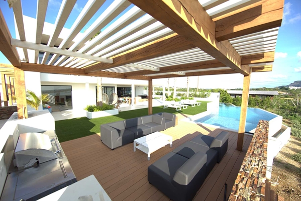Architectuur Via een lange oprit komt men aan bij de imposante entree van de woning, drie hoge met shutters afgewerkte puien markeren de voorgevel van het woonhuis, waaraan eikenhouten accenten zijn toegevoegd om het geheel een tropisch karakter mee te geven. De Belangrijkste verblijfsgebieden zijn zo gesitueerd dat het uitzicht op het Spaanse water en de tafelberg optimaal benut worden. Het zeer ruime overdekte terras heeft prachtig uitzicht op het nieuwe zwembad, het Spaanse water en de Caribische zee.