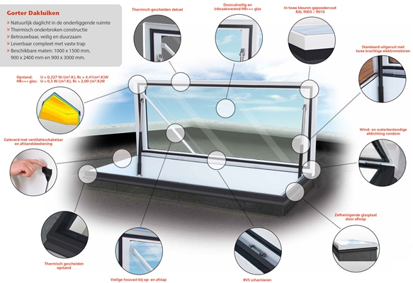 Het Gorter RHT-dakluik is volledig thermisch gescheiden en heeft een bewezen hoge isolatiewaarde waarmee de kans op ongewenste condensvorming geminimaliseerd is. Daarnaast is het luik volledig weer- en windbestendig, veilig (desgewenst elektrisch) te bedienen en gaat het gepaard met tien jaar garantie.